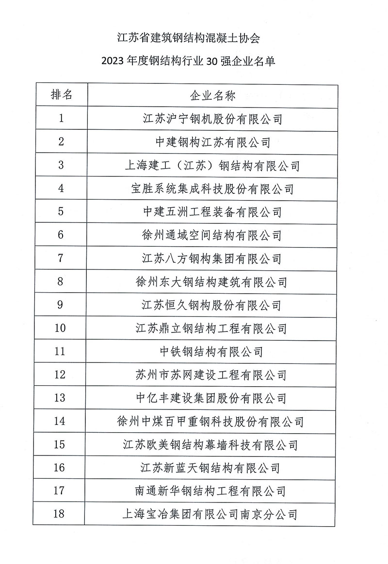 经钢结构会员单位积极申报,省协会秘书处根据申报材料结合认定指标进行综合排名确定,评出江苏省建筑钢结构混凝土协会2023年度钢结构行业30强企业,11.8-9徐州会议上将为30强企业颁奖